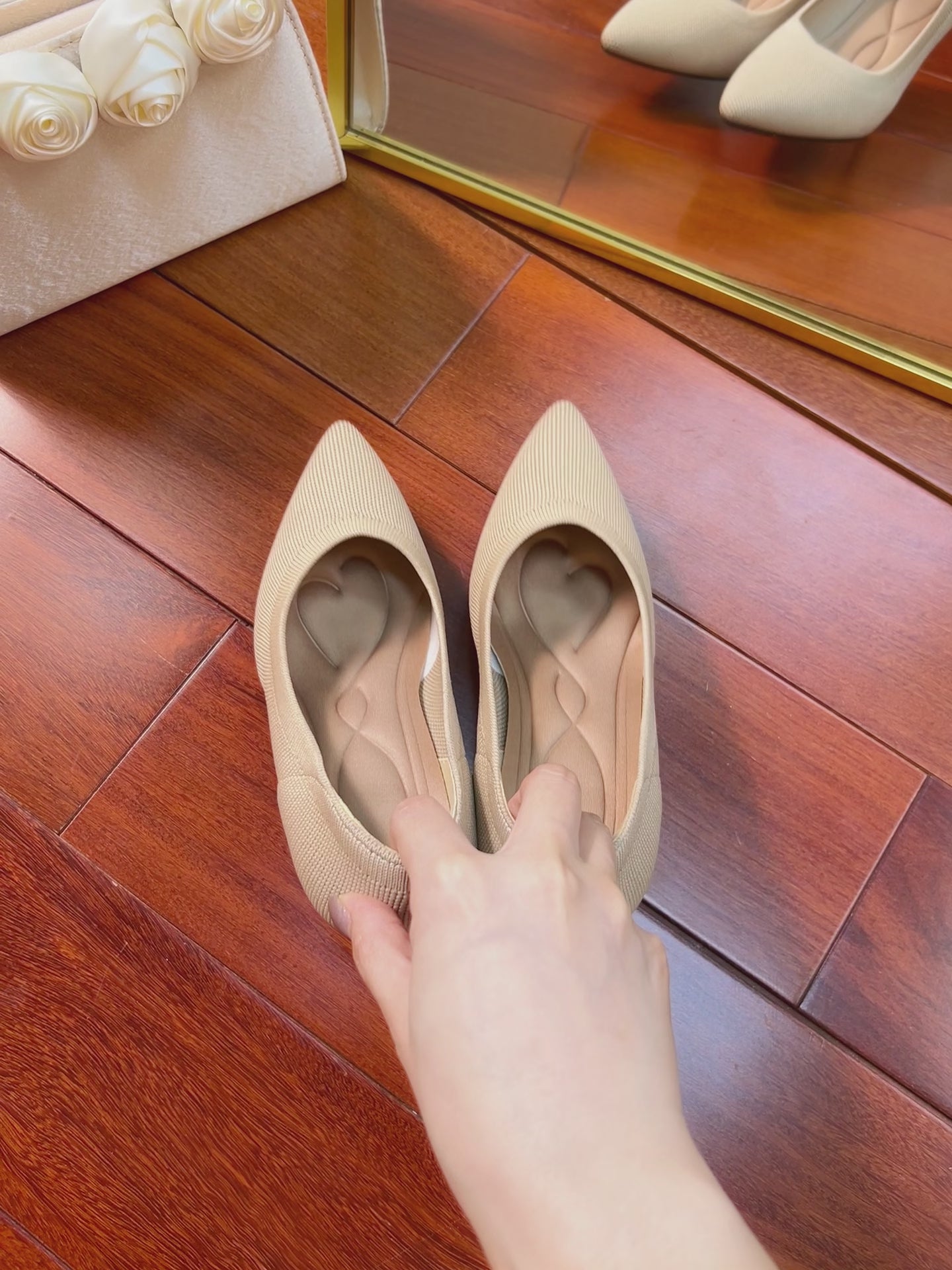 尖頭パールストラップウェッジヒールシューズ