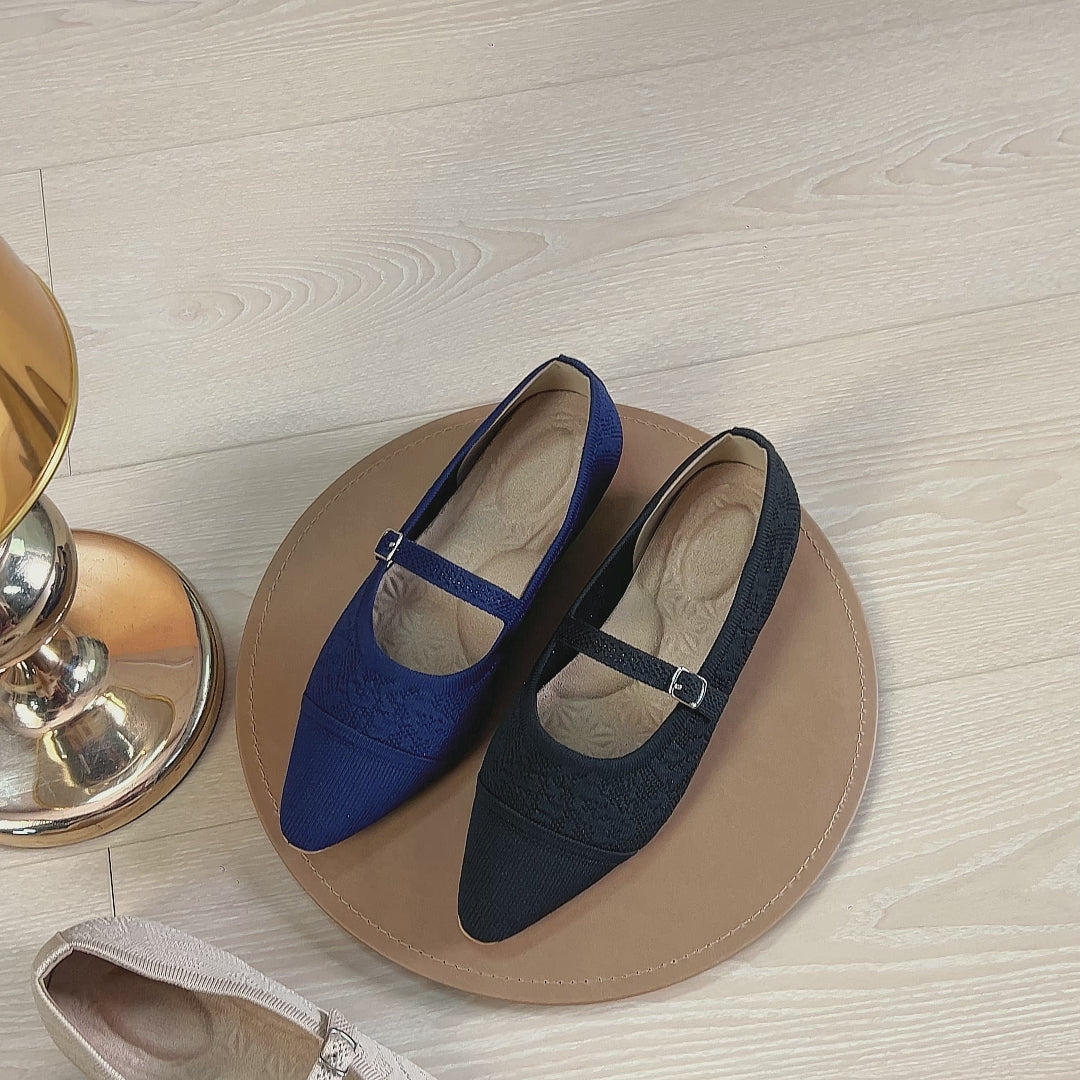 レトロニットフラットパンプス 尖頭浅口ワンストラップ